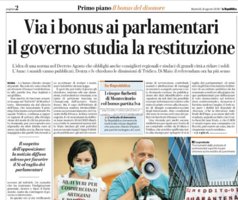 Tiene banco in parlamento lo scandalo "Furbetti" ovvero i deputati che hanno usufruito del Bonus Covid destinato alle partite Iva....