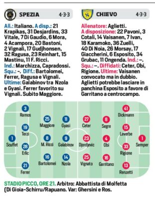 L'edizione odierna del "Corriere dello Sport" si sofferma sulle probabili formazioni di Spezia-Chievo, ritorno dei playoff di Serie B. All'andata...