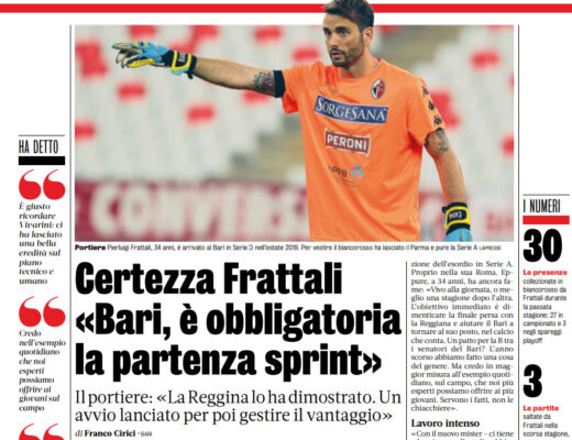 L'edizione odierna della "Gazzetta dello Sport" riporta le dichiarazioni di Pierluigi Frattali, portiere del Bari: «Abbiamo il dovere di guardare...
