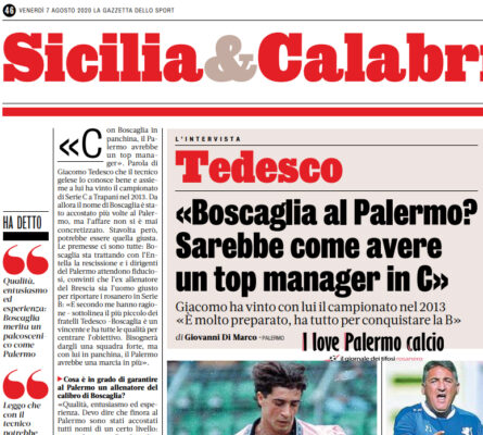 L'edizione odierna della "Gazzetta dello Sport" riporta le dichiarazioni di Giacomo Tedesco: «Con Boscaglia in panchina, il Palermo avrebbe un...