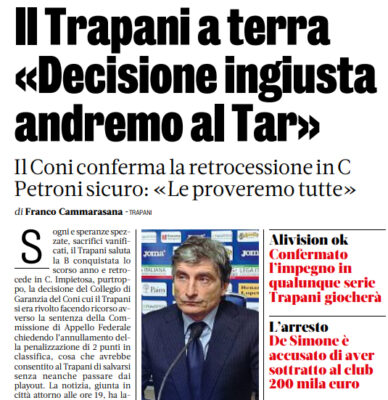 Gazzetta dello Sport: “Il Trapani a terra «Decisione ingiusta, andremo al Tar»”
