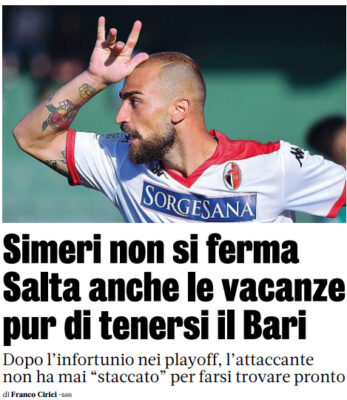 L'edizione odierna della "Gazzetta dello Sport" parla di Simeri del Bari. L’unico calciatore biancorosso ancora, o già, al lavoro. Tutta...