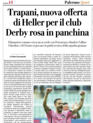 L'edizione odierna de "La Repubblica" si sofferma sul Trapani. Riprende quota la trattativa fra Giorgio Heller e Alivision per il...