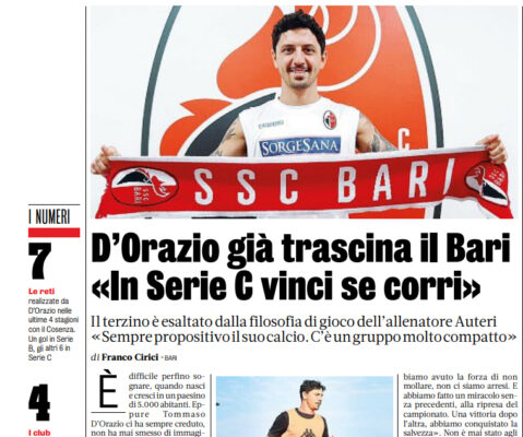 Uno dei giocatori su cui punta molto il Bari di Auteri è Tommaso D'Orazio. L'edizione odierna di "La Gazzetta dello...