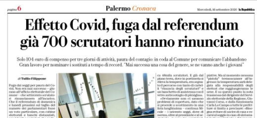 L'edizione odierna de "La Repubblica" si sofferma sulla fuga dei seggi per paura del Covid. Non era mai successo che...
