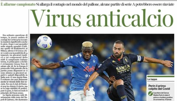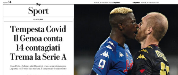 L'edizione odierna de "La Repubblica" si sofferma sui 14 positivi al Covid-19 nel Genoa. Il terremoto si abbatte sul campionato....