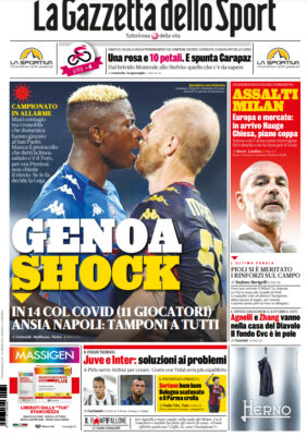 Nella sua prima pagina l'edizione odierna della "Gazzetta dello Sport" si sofferma sui 14 positivi al Covid-19 nel Genoa.