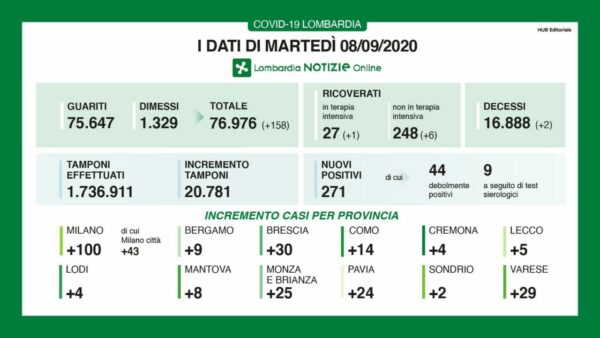 Nelle ultime 24 ore la Regione Lombardia ha registrato 271 nuovi contagi di Coronavirus. Il numero delle vittime è salito a 16.888 con un incremento di due...