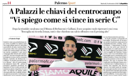 L'edizione odierna de "La Repubblica" riporta le dichiarazioni di Andrea Palazzi, centrocampista del Palermo: «E proprio perché ho vinto a...