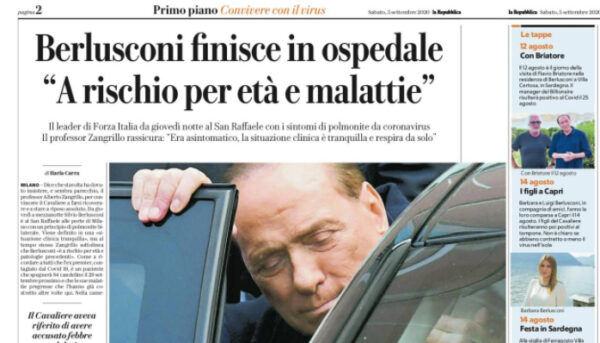 L'edizione odierna di "Repubblica" parla delle condizioni di salute di Berlusconi, colpito dal Coronavirus. Da giovedì a mezzanotte Silvio Berlusconi...