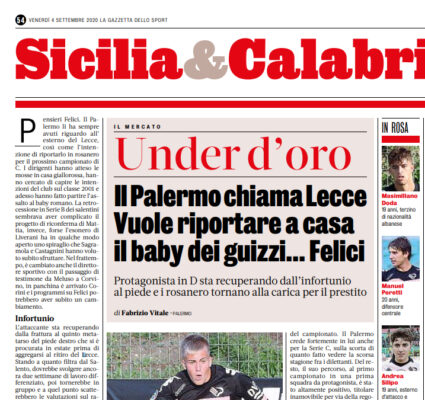 L'edizione odierna della "Gazzetta dello Sport" si sofferma sul calciomercato del Palermo. L'intenzione della dirigenza rosanero è riportare Felici in...