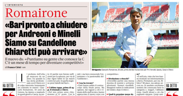 L'edizione odierna della "Gazzetta dello Sport" riporta le dichiarazioni di Giancarlo Romairone, DS del Bari: «Dovrebbe partire una mezza dozzina...