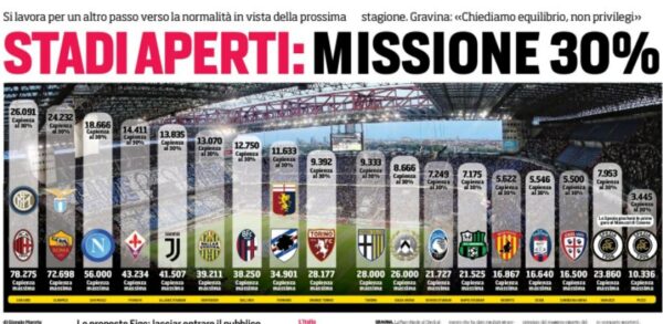 L'edizione odierna del "Corriere dello Sport" si sofferma sull'ipotesi di riapertura degli stadi. L'ultima proposta della Federcalcio è di consentire...
