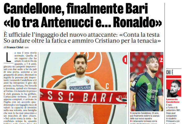 L'edizione odierna della "Gazzetta dello Sport" riporta le dichiarazioni di Leonardo Candellone, attaccante del Bari: «È una sfida importante, in...