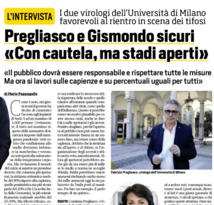 L'edizione odierna del "Corriere dello Sport" riporta le dichiarazioni degli esperti sulla riapertura degli stadi. Fabrizio Pregliasco spiega: «Dare l'ok...