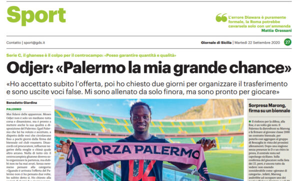 L'edizione odierna del "Giornale di Sicilia" riporta le dichiarazioni di Moses Odjer, centrocampista del Palermo: «Quando è arrivata l’offerta del...