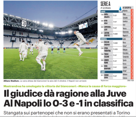 L'edizione odierna del "Giornale di Sicilia" si sofferma sull'esito di Juventus-Napoli. Zero a tre a tavolino per non essersi presentati...