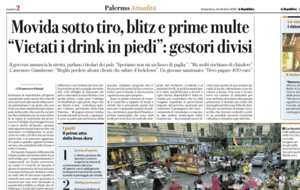 Repubblica: “Palermo. Movida sotto tiro, blitz e prime multe «Vietati i drink in piedi». Un giovane sanzionato «Devo pagare 400 euro»”