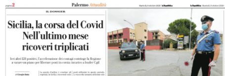 L'edizione odierna di "Repubblica" parla della situazione Coronavirus in Sicilia. Per frenare l’impennata di contagi, la più veloce d’Italia, la...