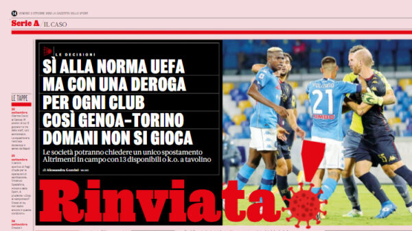 L'edizione odierna della "Gazzetta dello Sport" si sofferma sul rinvio di Genoa-Torino. La Serie A si è data una nuova...