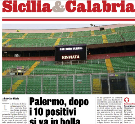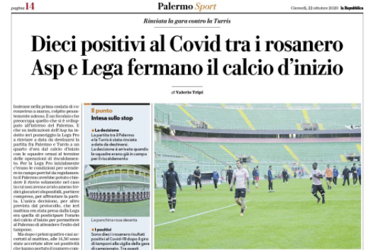 L'edizione odierna de la "Repubblica" si occupa del rinvio di ieri del match Palermo-Turris a causa delle 1o positività riscontrare...