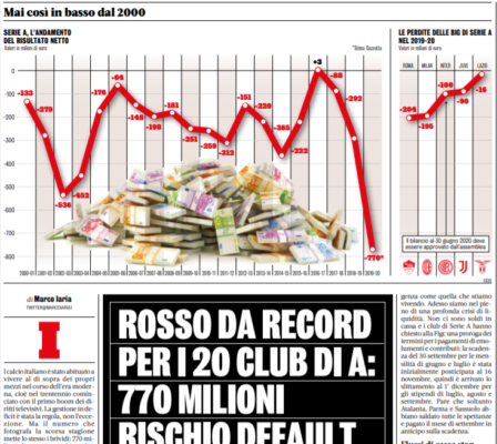 L'edizione odierna della "Gazzetta dello Sport" si sofferma sulla crisi dei club di Serie A. 770 milioni di euro: è...