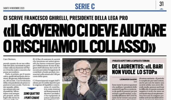 L'edizione odierna di "Tuttosport" riporta la lettera di Francesco Ghirelli, presidente della Lega Pro. Evidenziandone i contenuti salienti, il numero...