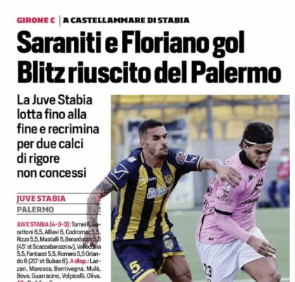 L'edizione odierna del "Corriere dello Sport" riporta le pagelle di Juve Stabia-Palermo. In basso i giudizi del quotidiano: