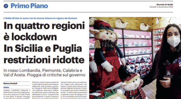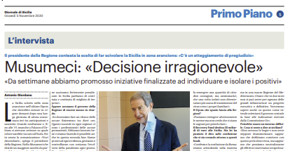 L'edizione odierna del "Giornale di Sicilia" riporta la reazione di Musumeci alla relega della Sicilia a zona arancione. «Inutile riunire...