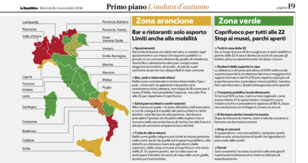 L'edizione odierna di "Repubblica" parla del Nuovo Dpcm. Per quanto riguarda la zona arancione, secondo la bozza circolata ieri sera,...