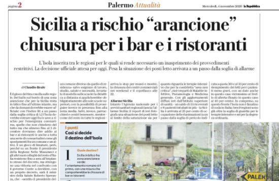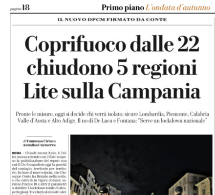 Repubblica: “Coprifuoco dalle 22 chiudono 5 regioni. Lite sulla Campania. Il no di De Luca e Fontana: «Serve un lockdown nazionale»”