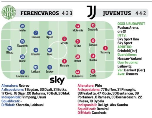Giornata di Champions League. Nel terzo turno della fase a gironi si incontrano Ferencvaros e Juventus. In alto le probabili...