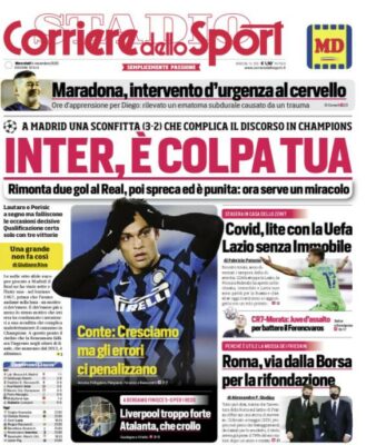 La prima pagina dell'edizione odierna del "Corriere dello Sport" parla dell'operazione al cervello a cui dovrà essere sottoposto Diego Armando...