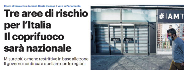 Gds: “Dpcm al varo entro domani, Conte incassa il voto in Parlamento. Tre aree di rischio per l’Italia. Il coprifuoco sarà nazionale”