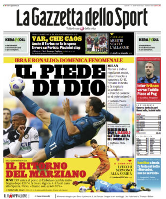 Nella sua prima pagina l'edizione odierna della "Gazzetta dello Sport" esalta le prestazioni di Zlatan Ibrahimovic e Cristiano Ronaldo. Il...