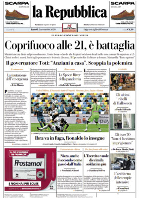 Nella sua prima pagina l'edizione odierna de "La Repubblica" si sofferma sulle ulteriori misure anti-Covid 19 in arrivo. Conte frena...