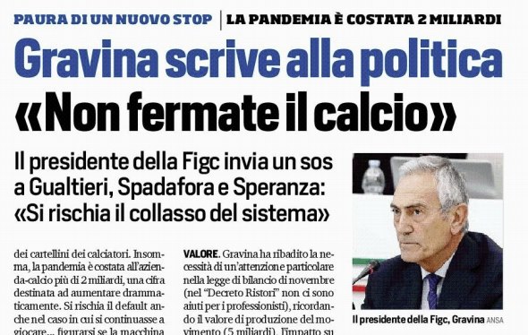 L'edizione odierna del "Corriere dello Sport" si sofferma sull'appello di Gabriele Gravina, presidente della FIGC, alla politica, al fine di...
