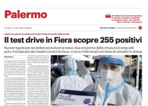 Gds: “Coronavirus. Palermo, il test drive-in alla Fiera scopre 255 positivi”