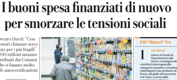 L'edizione odierna de "La Repubblica" si sofferma sui buoni spesa. Tornano per aiutare le famiglie più povere. Il decreto Ristori...