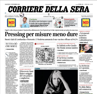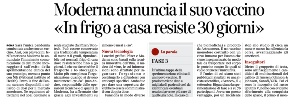 L'edizione odierna del "Corriere della Sera" parla del vaccino anti-Covid. Ieri l'americana Moderna ha annunciato l'imminente comunicazione di dati molto...