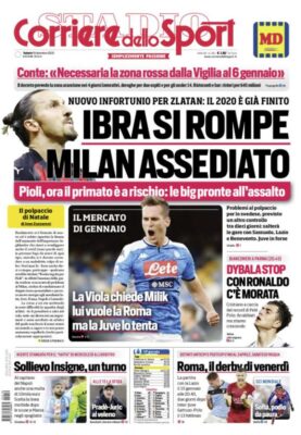 Nella sua prima pagina l'edizione odierna del "Corriere dello Sport" si sofferma sul nuovo infortunio di Ibrahimovic. Un altro problema...
