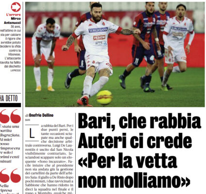 L'edizione odierna della "Gazzetta dello Sport" si sofferma sul pareggio del Bari contro la Vibonese. Amareggiato anche Gaetano Auteri. Mezza...