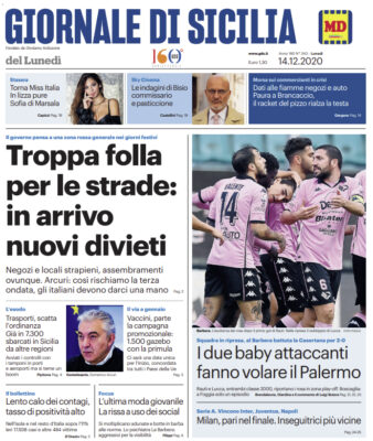 Prima pagina Giornale di Sicilia: “I due baby attaccanti fanno volare il Palermo. Troppa folla per le strade, in arrivo nuovi divieti”