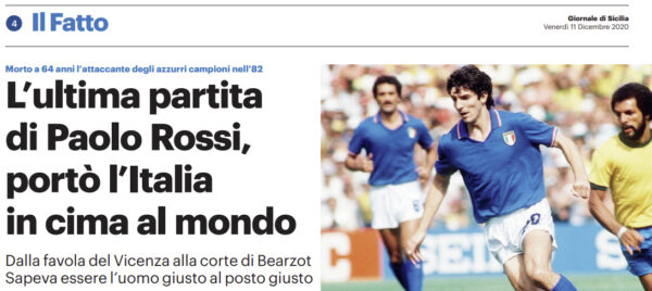 L'edizione odierna del "Giornale di Sicilia" si sofferma sulla scomparsa di Paolo Rossi. E' andato via a sorpresa, come quando...