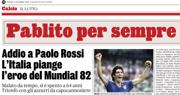 Gazzetta dello Sport: “Addio a Paolo Rossi. L’Italia piange l’eroe del Mundial 82. Le cause della malattia”