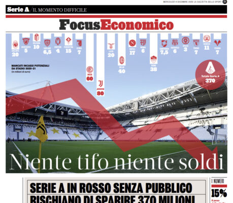 L'edizione odierna della "Gazzetta dello Sport" si sofferma sulla crisi della Serie A. Gli stadi chiusi al pubblico a causa...