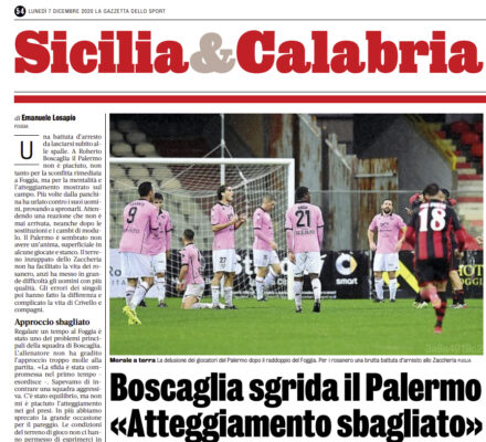 L'edizione odierna della "Gazzetta dello Sport" riporta le dichiarazioni di Roberto Boscaglia, allenatore del Palermo. «La sfida è stata compromessa...