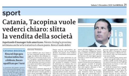 L'edizione odierna de "La Sicilia" si sofferma sul passaggio di consegne a Tacopina. Il Covid potrebbe far slittare l'approdo dell'italo-americano...