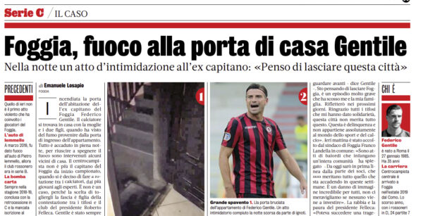 L'edizione odierna della "Gazzetta dello Sport" si sofferma sull'intimidazione subita da Federico Gentile, ex capitano del Foggia. Il calciatore si...