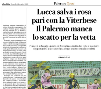 L'edizione odierna de "La Repubblica" si sofferma sul pari del Palermo contro la Viterbese. Dominare, passare in vantaggio, rischiare di...